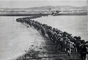 抗美援朝志愿军队伍雄赳赳、气昂昂跨过鸭绿江。(新华社发)