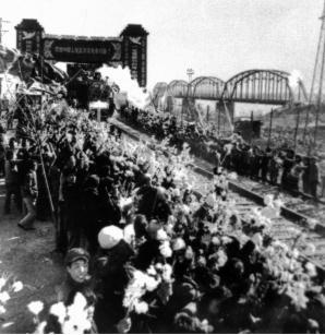 1958年10月26日,列车驶过鸭绿江畔的凯旋门,中国人民志愿军战士回到祖国怀抱。(新华社发)