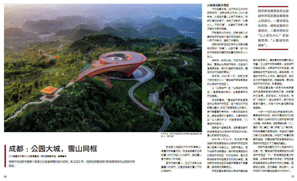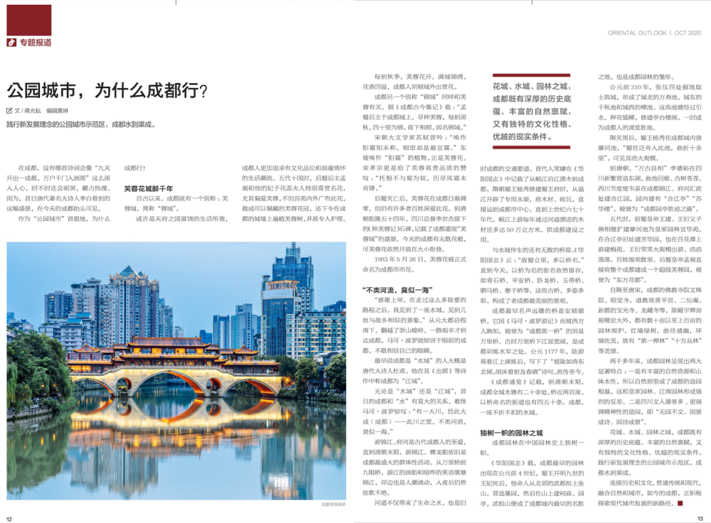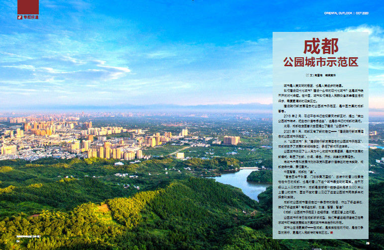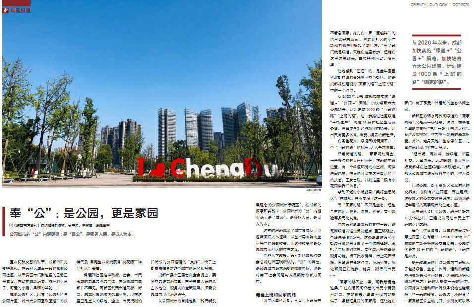《成都:公园城市示范区》首发于10月15日出版的《瞭望东方周刊》2020年第20-21期,以14篇、41页的巨大体量,全方位、多角度、立体式报道了成都“建设践行新发展理念的公园城市示范区”的相关谋划、具体举措和显著成绩。