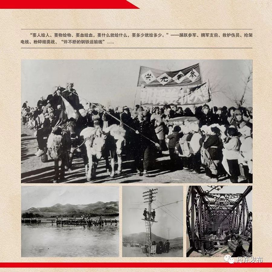 从城市到乡村,妻送郎、父送子、兄弟携手参军处处可见,孤山镇张家村模范军属陈书山先后把两个儿子送往前线、岫岩县葛藤村农民胡宝林兄弟三人互不相让最终一起报名参军……截至1950年底,丹东全市有8646名青壮年报名参加中国人民志愿军,并涌现出栗学福、许长有等战斗英雄。