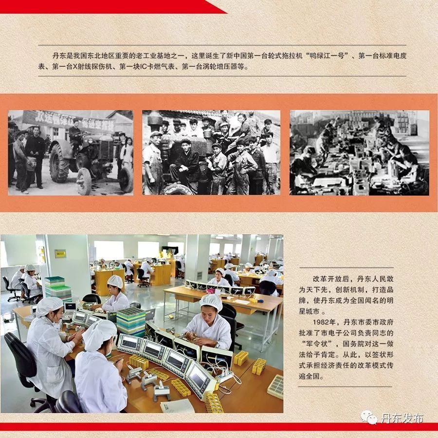 1965年,“安东市”改称“丹东市”。这座“红色东方之城”舒展怀抱,迎接新升的朝阳。改革开放后,丹东轻工业获得长足发展,涌现出一大批明星品牌:菊花牌电视机、孔雀牌手表、康齿灵牙膏、白翎牌金笔、巨浪牌胶版纸、黄海大客车、东方齐洛瓦冰箱……136种产品产量居全国同类第一,都记载着丹东曾经的辉煌。