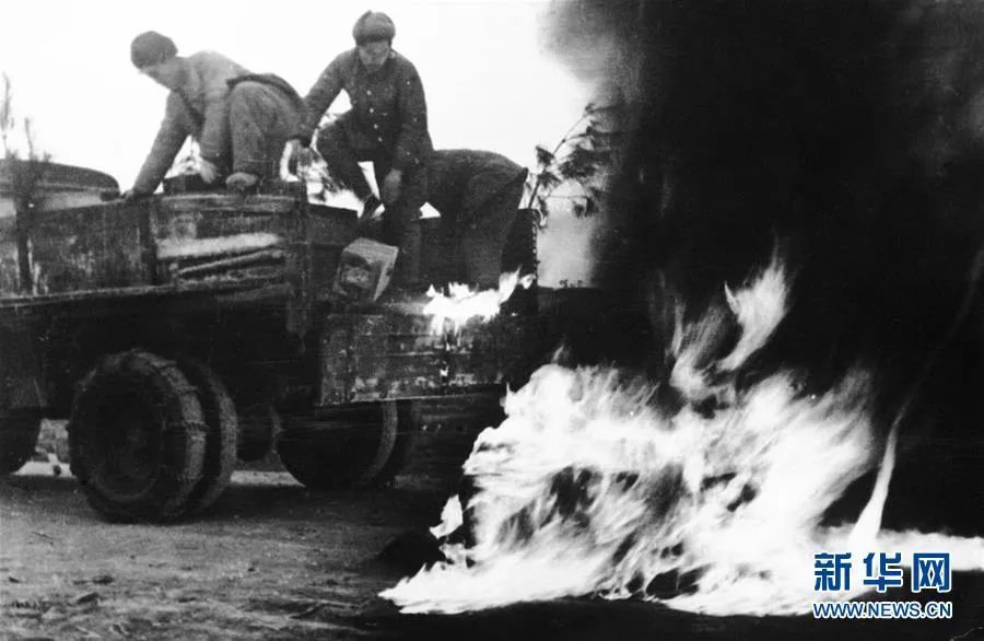 抗美援朝时期,中国人民志愿军运输部队的战士奋勇抢救被敌机轰炸起火的军需物资(资料照片)。新华社发