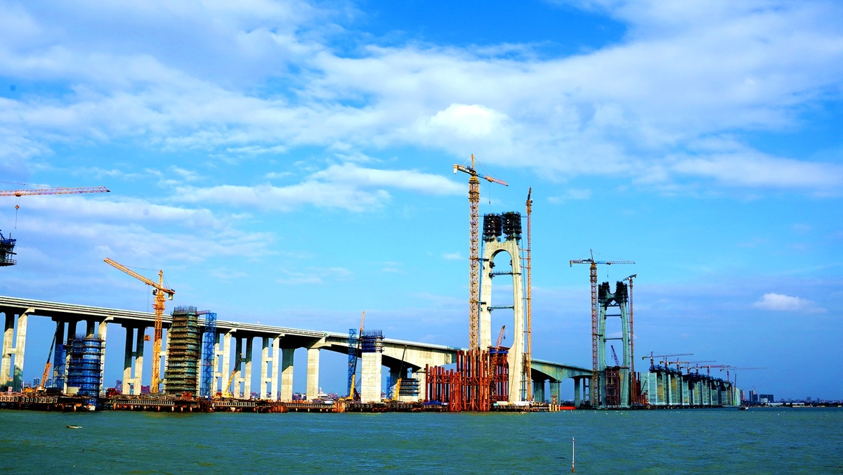 安海湾特大桥是福厦高铁控制性工程,全长9.46公里,其中跨海区段全长1.56公里。主桥为650米双塔双索面钢混结合梁半漂浮体系斜拉桥,跨越安海湾主航道。大桥主跨300米,主塔高126.9米,为H形曲线造型,外观像微张的扇贝,呈现出开放包容的姿态。
