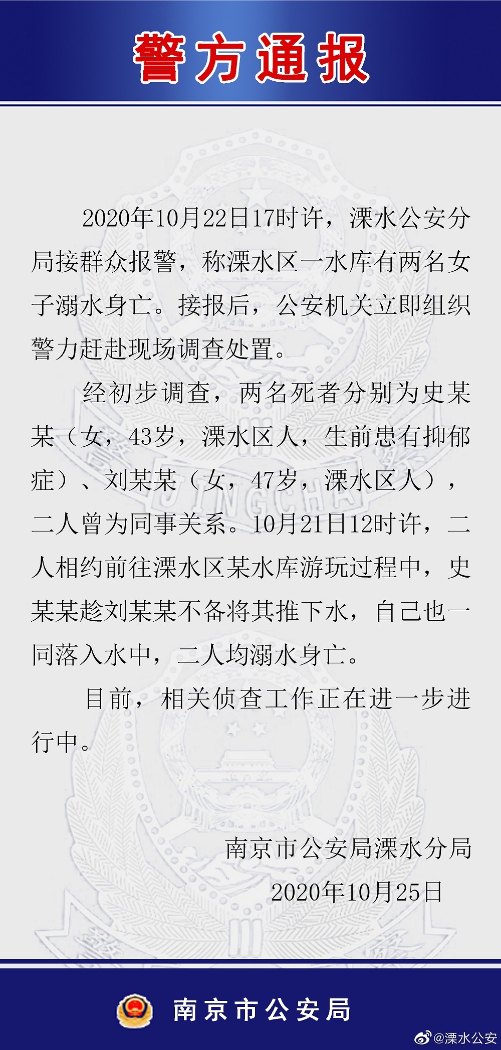 10月22日17时许,溧水公安分局接群众报警,称溧水区一水库有两名女子溺水身亡。经初步调查,两名死者分别为史某某(女,43岁,溧水区人,生前患有抑郁症)、刘某某(女,47岁,溧水区人),两人曾为同事关系。10月21日12时许,二人相约前往溧水区某水库游玩过程中,史某某趁刘某某不备将其推下水,自己也一同落入水中,两人均溺水身亡。(总台央视记者 黄鹤飞)