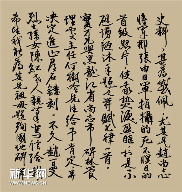己亥盛夏,原解放军艺术学院文学系学员、赵尚志将军颅骨发现者姜宝才兄邀我为赵尚志将军题写殉国地与躯体投江处碑文,我毫不犹豫地拒绝了。非是吾对英烈不敬,乃自知人微字陋,无资格担此重任也。后经宝才兄开导劝说,使我心有所动,乃开始研读将军事迹与东北抗日联军史料,甚为感佩,尤其是赵尚志将军那张由日军拍摄的死不瞑目的首级照片,使我热泪盈眶,于是不避谫陋沐手题之并赋七律一首。宝才兄与黑龙江省尚志市碑林管理处主任何树岭先生给予肯定,并决定进山寻石镂刻。不久,赵一曼烈士孙女陈红老人亲笔写信给我,希望我能为其先祖母题殉国地碑并赋颂诗。吾知早有诸多党政要人、社会名流为赵一曼烈士题词赋诗,吾何德何能敢为此续貂之举,故讬宝才兄诚恳婉言拒之。但陈红老人一再命题,使我犹豫不决。一日午间小寐,梦中似至一山坡上,见一英武女侠,身披红绸,骑白马呼啸而过。此正为久思成梦也。
