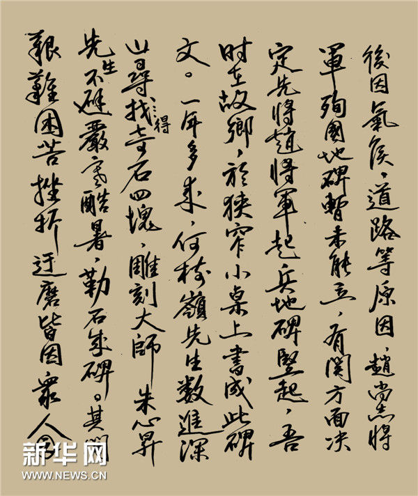 于是沐手恭书,一遍而成碑铭,颂诗也于数日后写就。后因气候、道路等原因,赵尚志将军殉国地碑暂未能立,有关方面决定先将赵将军起兵地碑竖起,吾时在故乡,于狭窄小桌上书成此碑文。一年多来,何树岭先生数进深山寻得奇石四块,雕刻大师朱心升先生不避严寒酷暑,勒石成碑。期间艰难困苦挫折迂磨皆因众人敬仰先烈之心赤诚感天动地而一一化解,终将四块丰碑矗立在白山黑水之间,蓝天白云之下。
