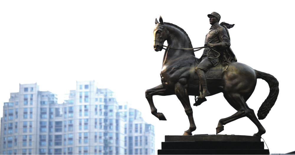 东临黄海,西襟淮扬,位于里下河下游的盐城,河网密布、地势平坦。市中心,解放路、建军路两条主干道的交汇之处,有一座被盐城市民亲切称为“大铜马”的雕塑。年轻英武的新四军战士,身背大刀、手握缰绳,骑在高扬前蹄的战马背上,面向朝阳昂首东望。