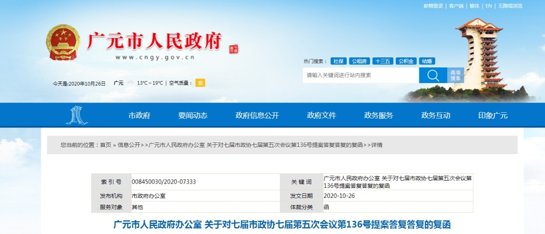 近日,广元市人民政府网站发布了《广元市人民政府办公室 关于对七届市政协七届第五次会议第136号提案答复答复的复函》。