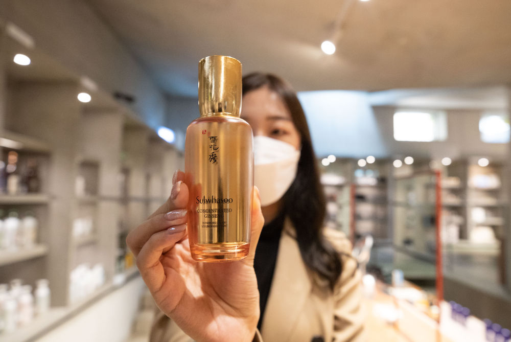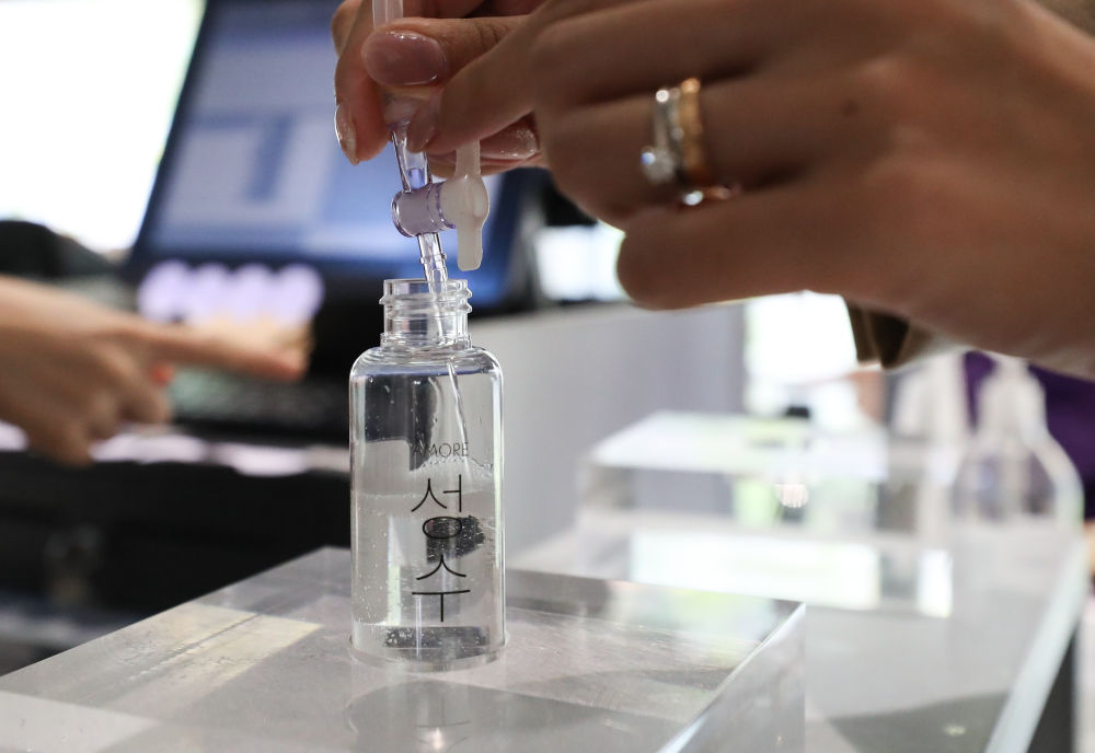 ↑10月27日,一名顾客在位于韩国首尔城东区的爱茉莉圣水美妆体验空间灌装爽肤水。