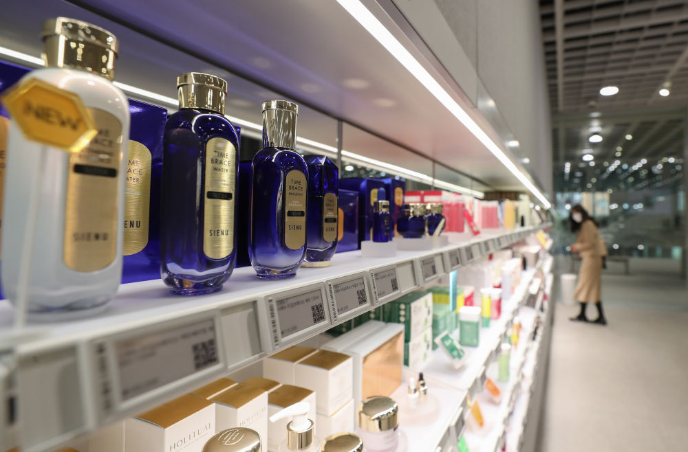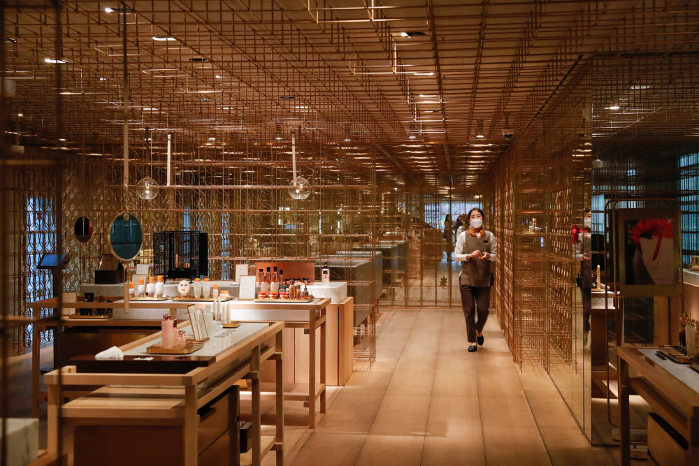 ↑这是10月27日在韩国首尔龙山区拍摄的爱茉莉太平洋总部大楼内的“爱茉莉商店”。