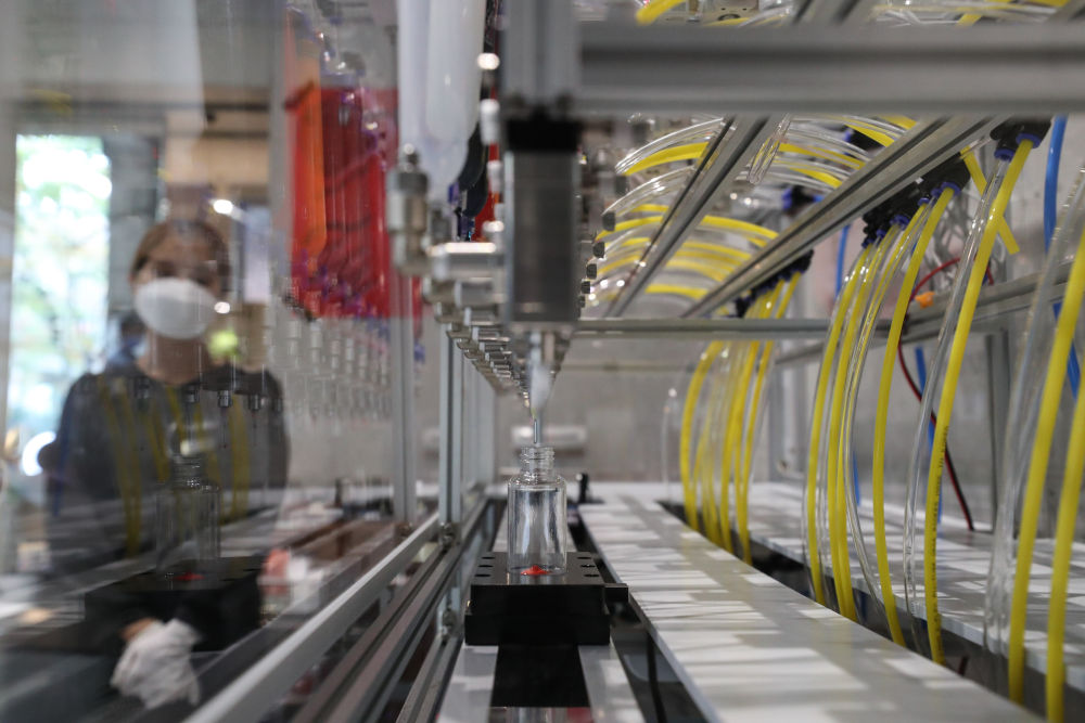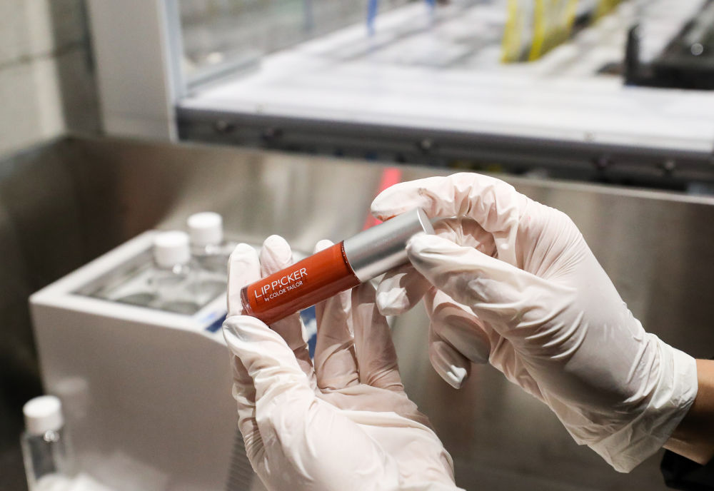 ↑10月27日,一名工作人员在位于韩国首尔城东区的爱茉莉圣水美妆体验空间制作顾客定制的口红。