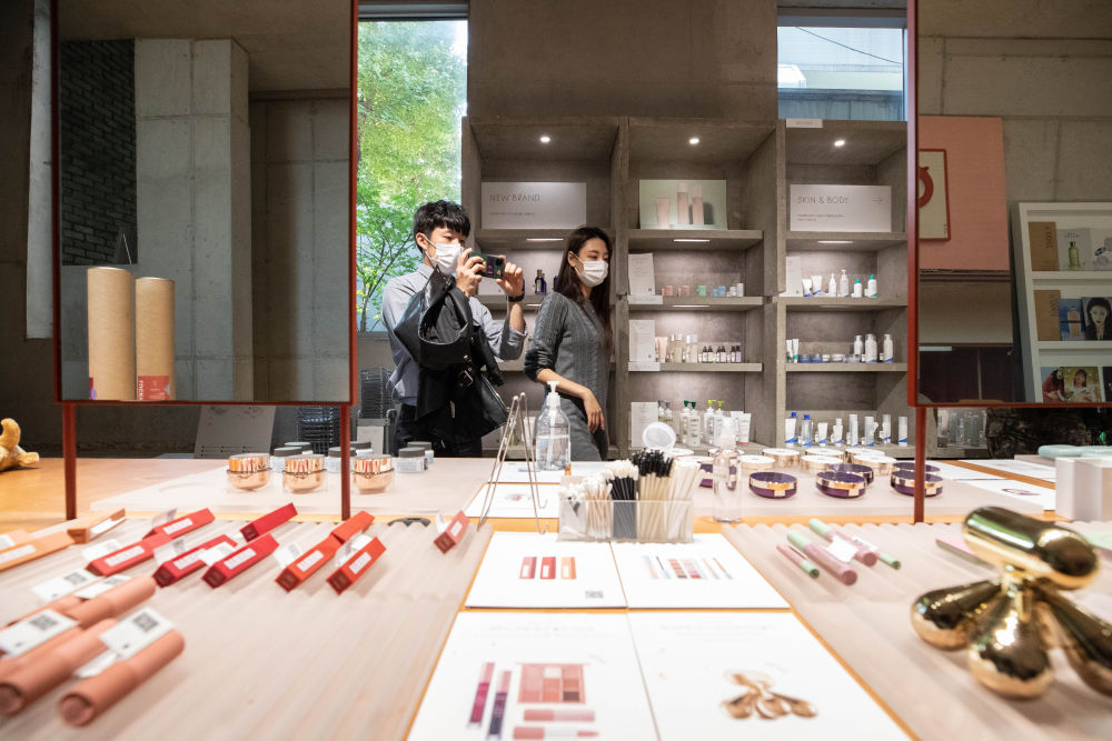 ↑10月27日,参观者在位于韩国首尔城东区的爱茉莉圣水美妆体验空间体验美妆产品。