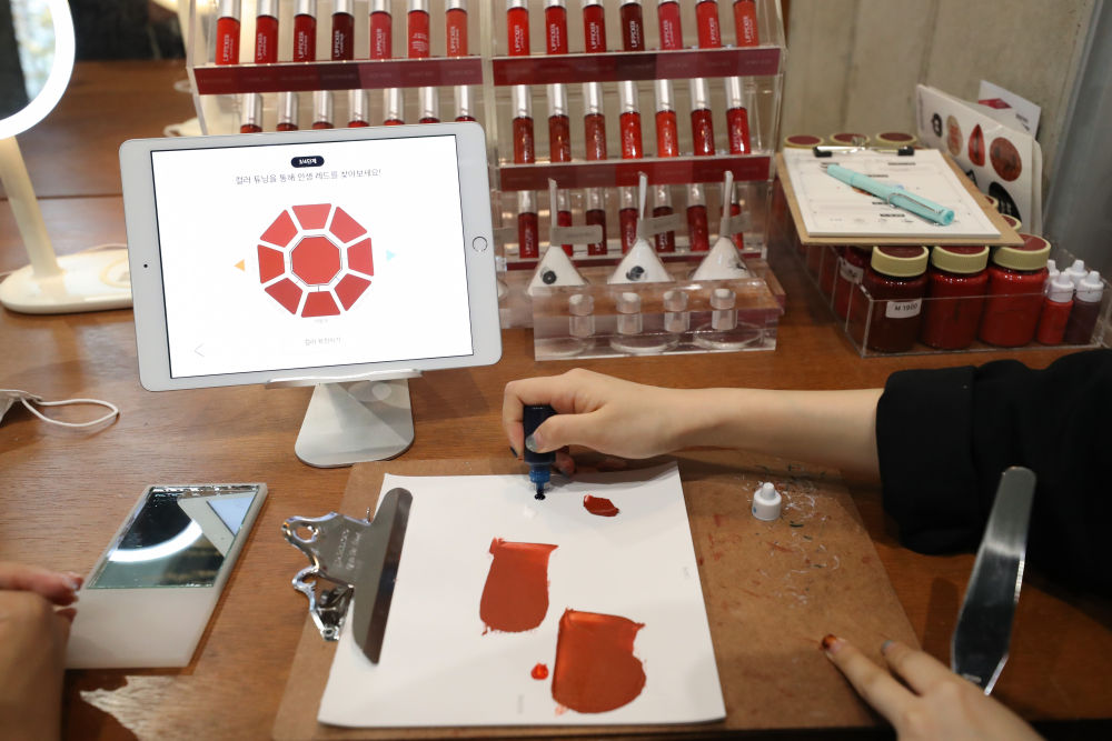 ↑10月27日,一名工作人员在位于韩国首尔城东区的爱茉莉圣水美妆体验空间帮助顾客定制口红。