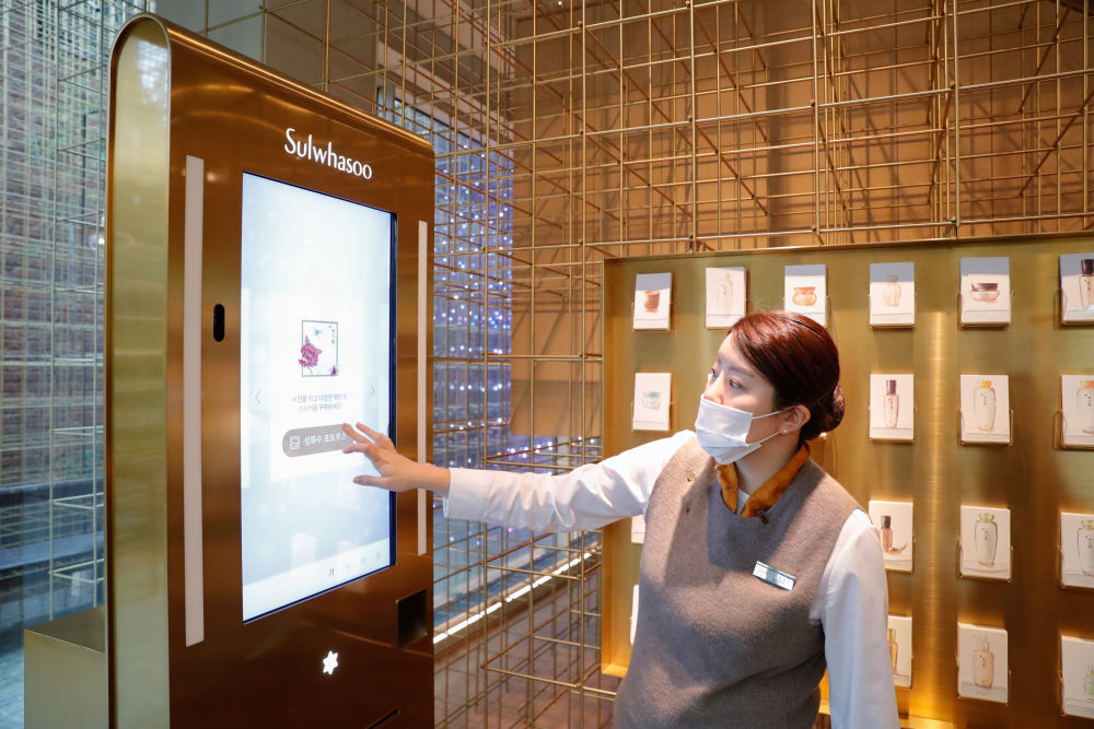 ↑10月27日,工作人员在位于韩国首尔江南区的爱茉莉太平洋雪花秀旗舰店内指导客人体验店内设施。