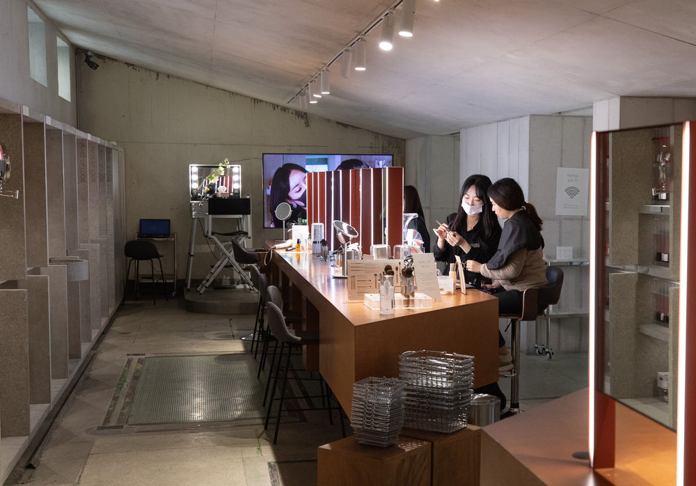 ↑10月27日,人们参观位于韩国首尔城东区的爱茉莉圣水美妆体验空间。