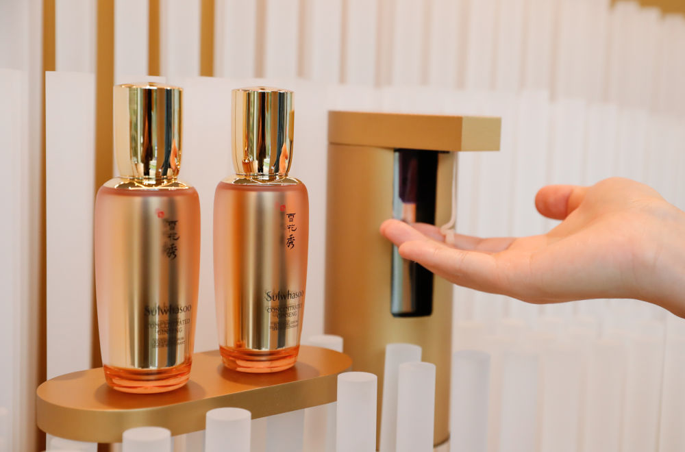 ↑10月27日,一名工作人员在位于韩国首尔城东区的爱茉莉圣水美妆体验空间展示将在进博会上推出的新产品。