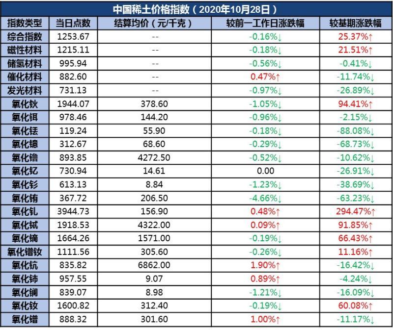 其中,氧化钆、氧化铽、氧化钪、氧化铈、氧化镨单品价格指数分别较前一工作日上涨;氧化钬、氧化铒、氧化铥、氧化镱、氧化镥、氧化钐、氧化铕、氧化镝、氧化镨钕、氧化镧、氧化钕单品价格指数分别较前一工作日下跌;氧化钇单品价格指数与前一工作日持平。