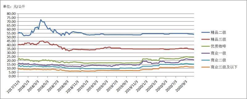 具体来看,精品二级咖啡豆均价报53.35元/公斤,较上期下跌0.37元/公斤,跌幅0.69%;精品三级咖啡豆均价报34.25元/公斤,较上期下跌0.26元/公斤,跌幅0.75%;优质咖啡豆均价报23.95元/公斤,较上期下跌0.12元/公斤,跌幅0.50%;商业一级咖啡豆均价报20.90元/公斤,较上期下跌0.29元/公斤,跌幅1.37%;商业二级咖啡豆均价报15.22元/公斤,较上期下跌0.17元/公斤,跌幅1.10%;商业三级及以下咖啡豆均价报11.39元/公斤,较上期下跌0.21元/公斤,跌幅1.81%。