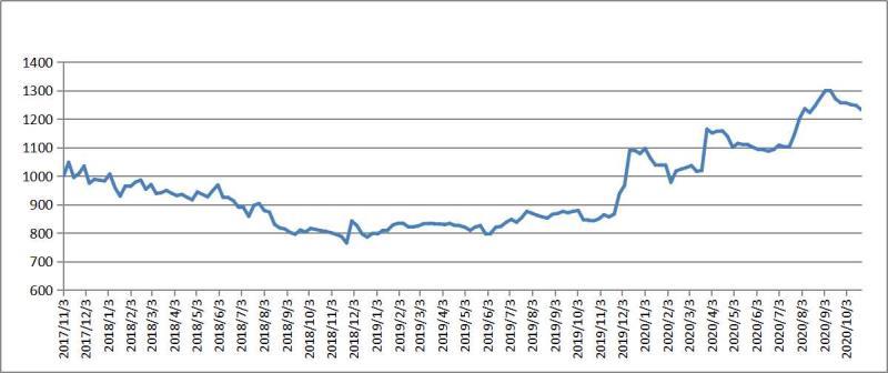 10月23日,指数报1232.46点,较上期(2020.10.12-10.18,下同)下跌14.80点,跌幅1.19%,与基期相比上涨232.46点,涨幅23.25%。