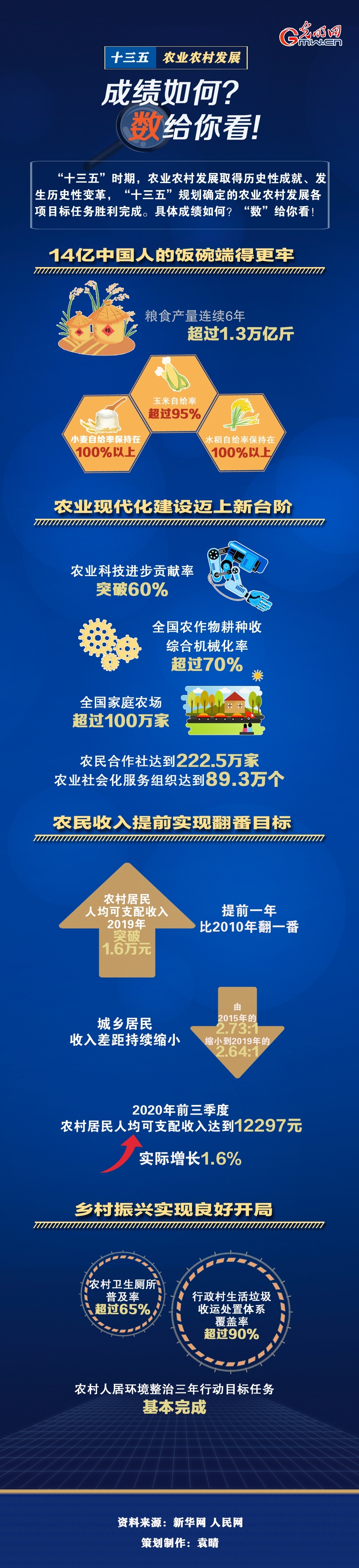 “十三五”时期,农业农村发展取得历史性成就、发生历史性变革,“十三五”规划确定的农业农村发展各项目标任务胜利完成。具体成绩如何?“数”给你看!