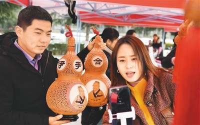 近年来,陕西省渭南市合阳县将电子商务作为县域经济转型的新动力,先后举办电商欢乐购物节、电商农产品展销会等系列活动。图为电商平台工作人员在合阳县“电商赶大集”活动现场直播推广葫芦灯。新华社记者 陶 明摄