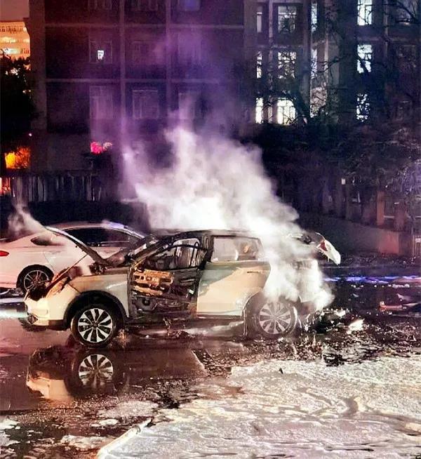 从现场图片看,这辆起火的威马电动车是在无充电的状态发生起火的。消防部门及时到场扑火,这辆威马EX5的车门被炸开,后轮处冒出白色的浓烟。威马电动车前机舱和前排座椅被完全烧毁,整车面临着报废。
