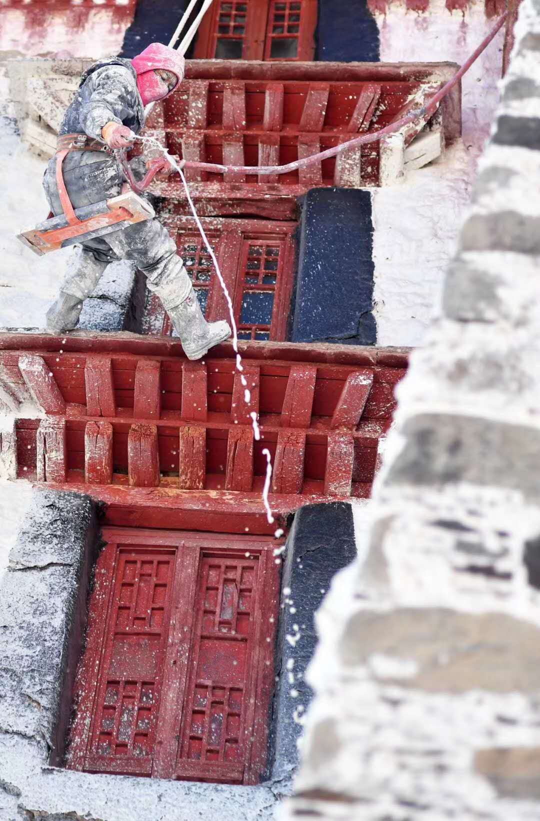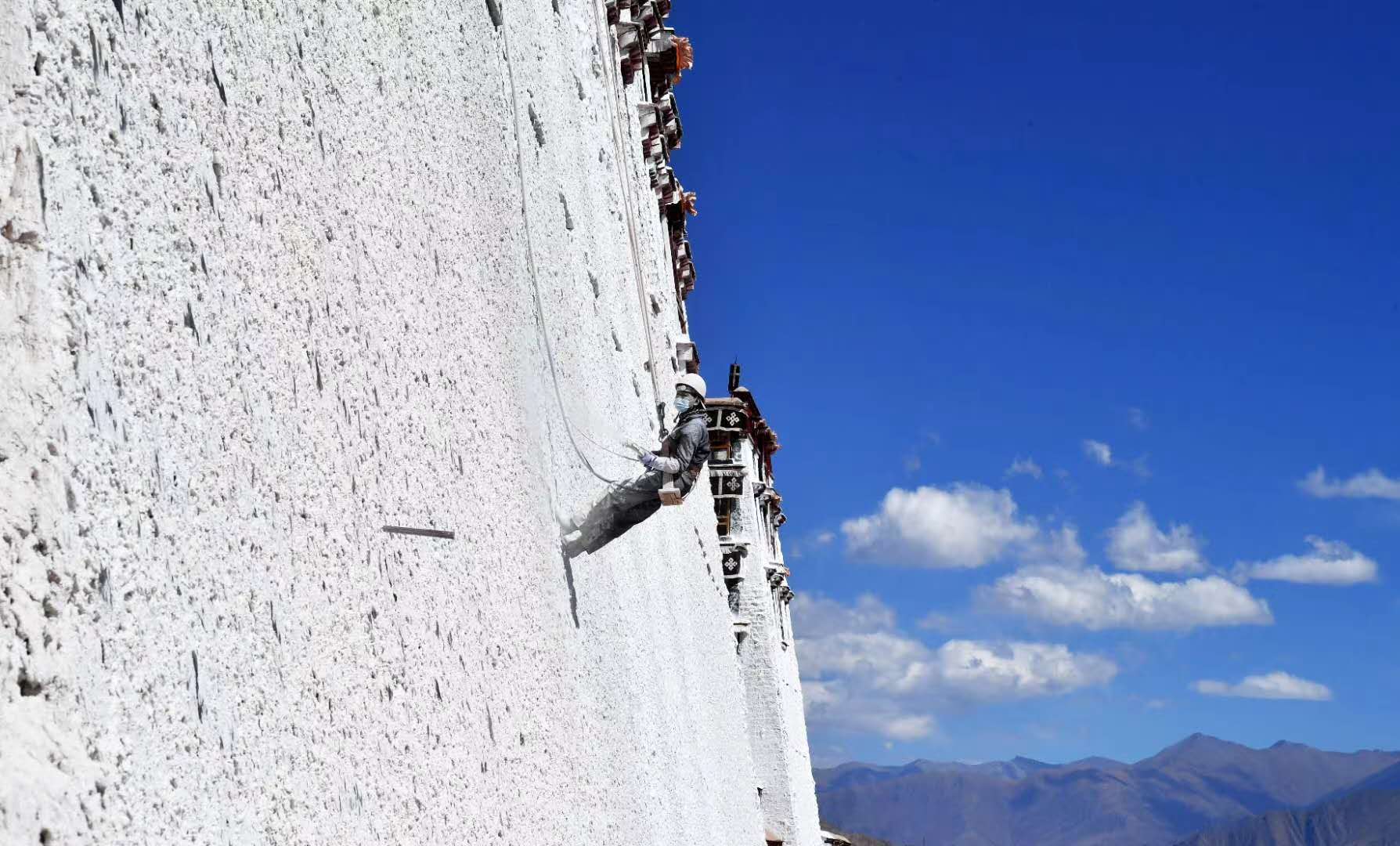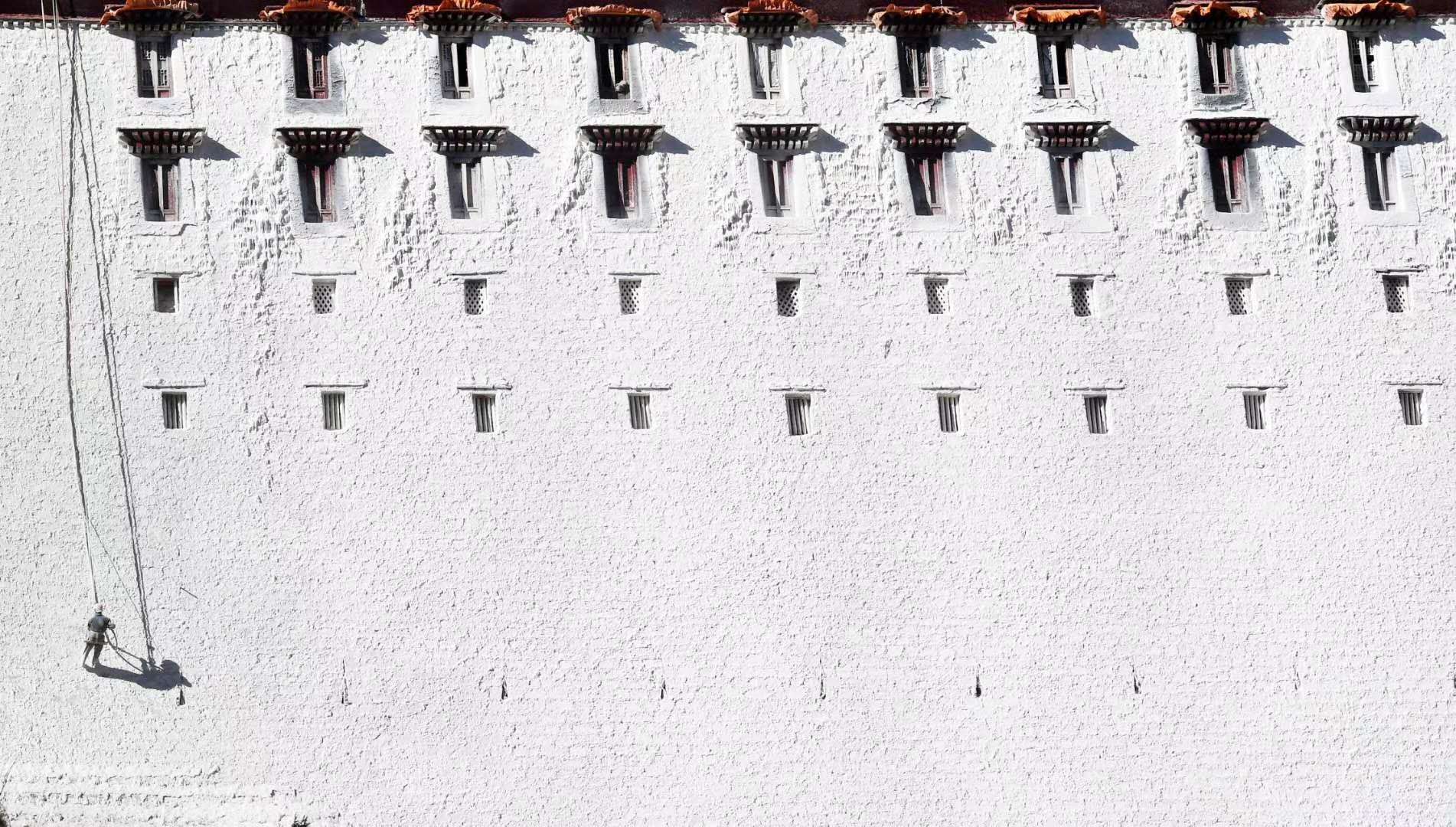 近日,拉萨布达拉宫开始进行粉刷维护。每年,秋冬交替时节,布达拉宫管理处都要组织工作人员对外墙进行粉刷,以保持外墙颜色鲜亮。觉果 摄