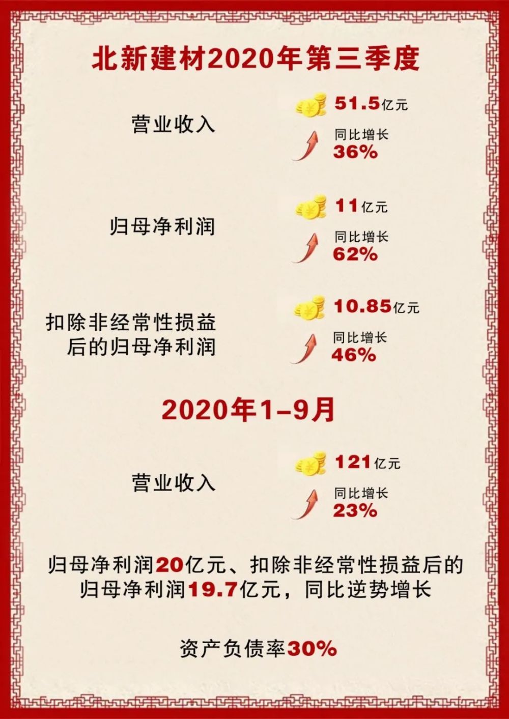 其中,2020年7-9月北新建材营业收入51.5亿元,同比增长36%;归母净利润11亿元,同比增长62%;扣除非经常性损益后的归母净利润10.85亿元,同比增长46%。