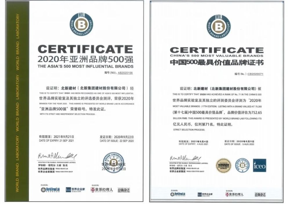 世界品牌实验室(World Brand Lab)发布2020年《中国500最具价值品牌》《亚洲品牌500强》排行榜,北新建材品牌价值达 752.65 亿元,再次蝉联亚洲建材品牌三强。