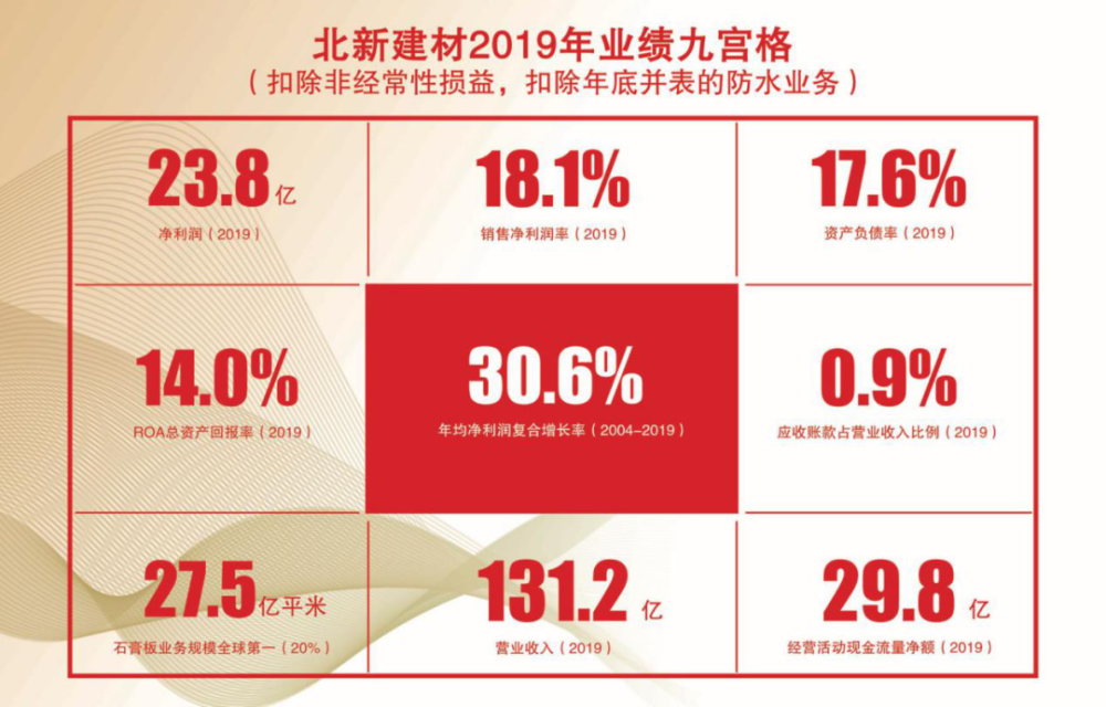 10月28日,北新建材(000786.SZ)发布2020年三季度报告。2020年1-9月,北新建材营业收入121亿元,同比增长23%;利润总额24亿元,净利润21.3亿元,归母净利润20亿元,扣除非经常性损益后的归母净利润19.7亿元,营业收入和各类口径的利润全部实现逆势双增长。截至2020年9月30日,北新建材总资产237亿元,资产负债率30%。