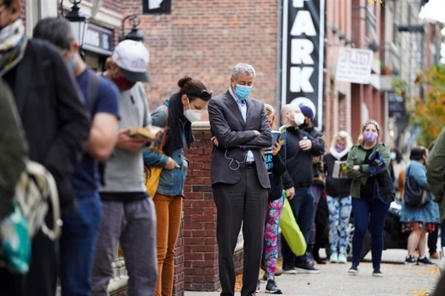 10月27日,在美国纽约布鲁克林的一处投票站外,纽约市长德布拉西奥(中)排队等待投票。当日,德布拉西奥与民众一道排队三个多小时完成自己的2020大选提前投票,以此呼吁选举委员会增加人员和投票设备,以减少选民的等待时间。新华社记者王迎摄