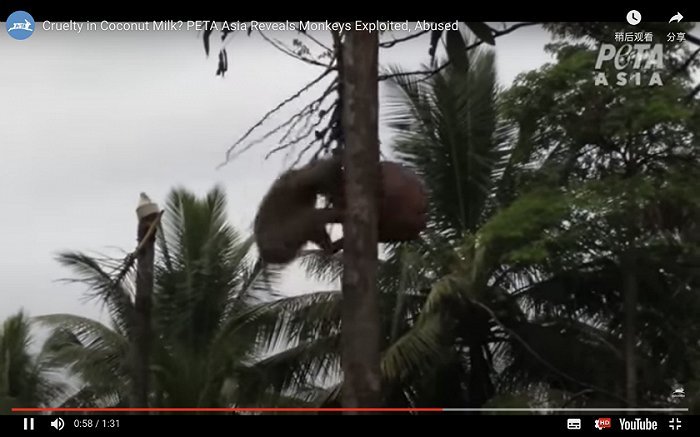 自2019年以来, PETA一直在追踪世界各地的虐待动物事件,并敦促零售商撤下由“剥削动物的人”制造的商品。近期PETA宣布,经过他们的调查,发现大部分来自泰国的椰子都是猴子采摘的。
