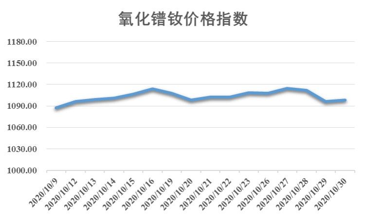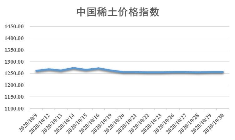 新华财经北京10月30日电(刘星麟)10月稀土市场整体持稳,镝、铽氧化物报价弱势震荡,氧化镨钕价格稳中偏强。截至10月30日,中国稀土价格指数报1255.65点,较上月末(9月30日)上涨4.26点,涨幅为0.34%。