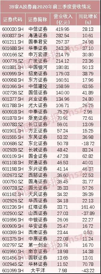 相比2020中报,三季报中百亿元收入券商数量增至13家。