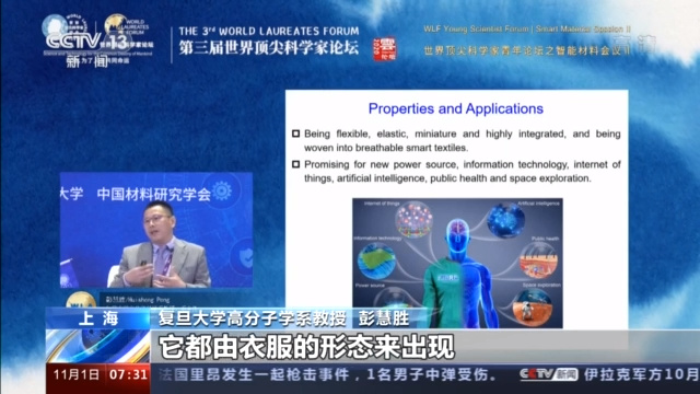 来自复旦大学高分子学系的彭慧胜教授正在分享一项将电子器件做成纤维形态的技术。这项技术将使我们的衣服可以变成屏幕、数据存储设备,甚至是通讯终端。