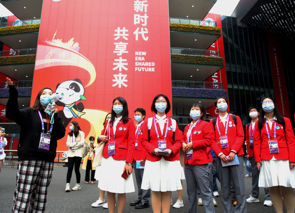 10月28日,第三届中国国际进口博览会的近千名志愿者分时段、分批次进入国家会展中心(上海)巡馆。新华社发