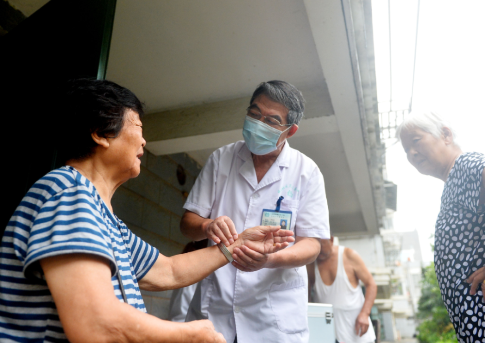 ▲2020年8月8日上午,扬州市景区城北街道鸿福社区卫生服务站的全科主治医师易成顺到小区里为病人看病。图/IC photo