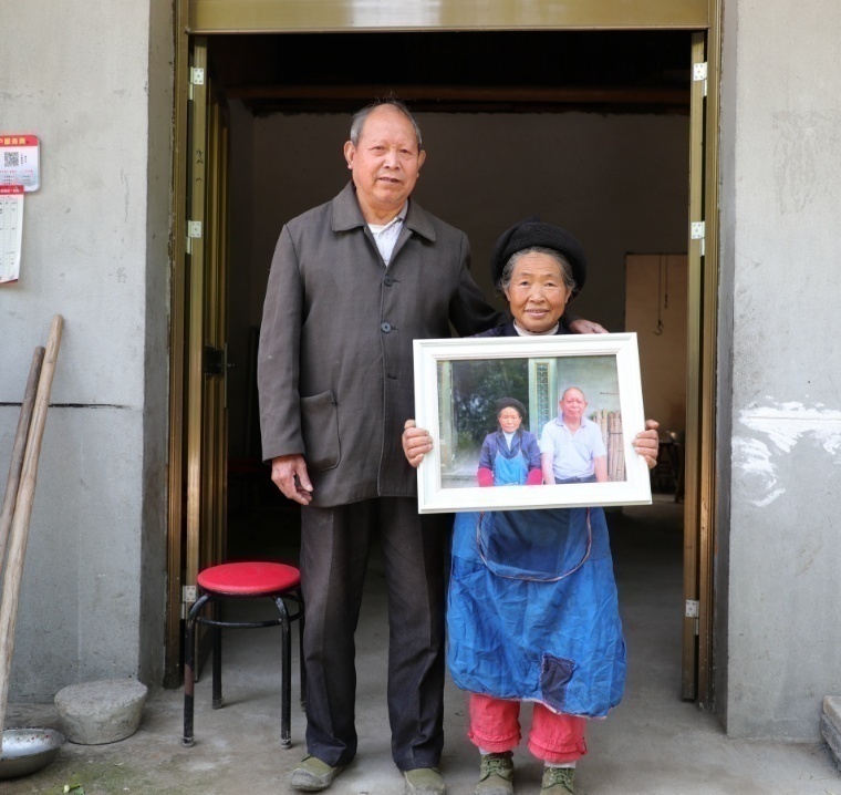 (图为汪金水夫妇站在家门口展示着民警为他们拍的合照。)