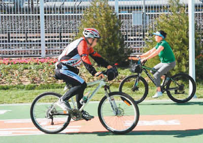 北京回龙观至上地自行车专用路是北京首条专门服务于自行车通行的道路。图为市民在自行车专用路上骑行。