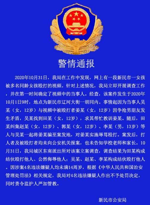2020年10月31日,我局在工作中发现,网上有一段新民市一女孩被多名同龄女孩殴打的视频。针对上述情况,我局立即开展调查工作,并在第一时间确定了视频中的当事人。经查,该案件发生于2020年10月1日9时,地点为新民市辽河大街一胡同内。事情起因为当事人吴某(女,12岁)与视频中被殴打者姜某(女,12岁)因争抢男朋友发生矛盾,吴某找到田某(女,12岁),求其帮忙教训姜某。随后,田某纠集赵某(女,12岁)、郭某(女,12岁)、李某(男,13岁)等人与吴某一起将姜某骗至案发地,对姜某实施辱骂殴打。案发后,打人者及被殴打者均未向公安机关报案,也未告知学校老师和家长。10月31日,我局城区东南派出所对该案立案调查,调查结果为田某构成结伙殴打他人、公然侮辱他人;吴某、赵某、李某构成结伙殴打他人。因涉案4名违法嫌疑人均未满14周岁,根据《中华人民共和国治安管理处罚法》相关规定,我局对4名违法嫌疑人作出不予处罚决定,同时责令监护人严加管教。