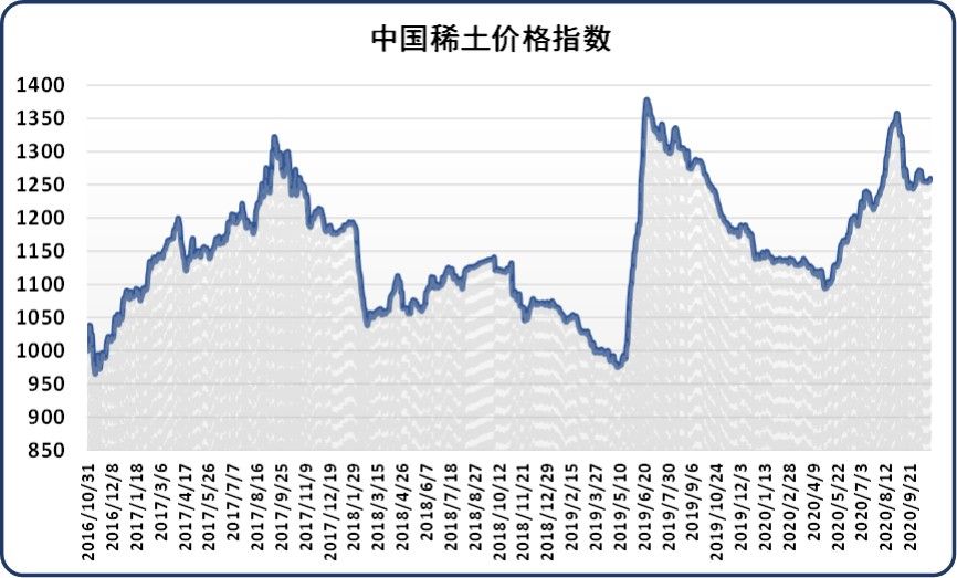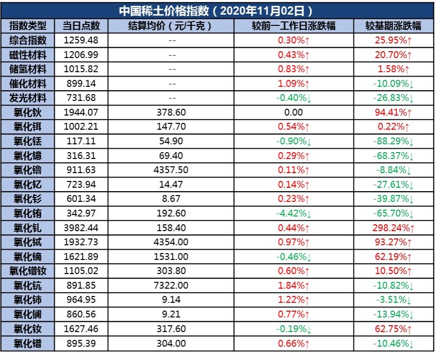 新华财经北京11月2日电(刘星麟)2日,中国稀土价格指数报1259.48点,较前一工作日上涨3.83点,涨幅为0.30%。氧化镨钕价格延续上涨走势,市场现货供应仍显紧张,磁材企业接受意愿一般,按需采购为主。