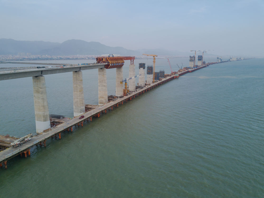 近日,新建福厦铁路湄洲湾跨海大桥作业加紧推进,施工单位克服入秋以来海上风大浪大、昼夜温差大等困难,确保工程进度。福厦高铁是我国首条跨海高铁。