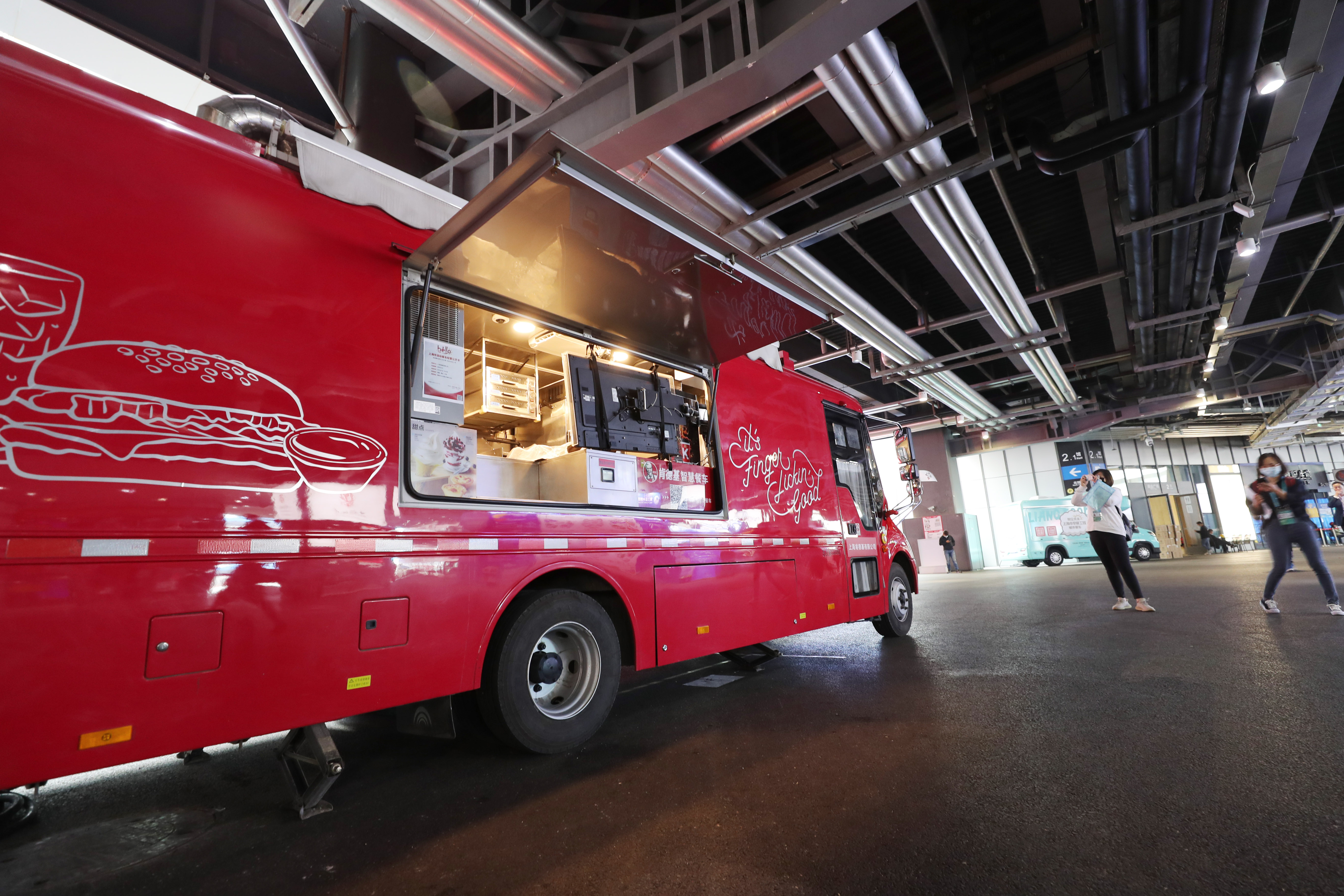 ↑11月2日,人们从停在展馆商业区内的一部移动餐车旁走过。本届进博会新增了移动餐车服务。