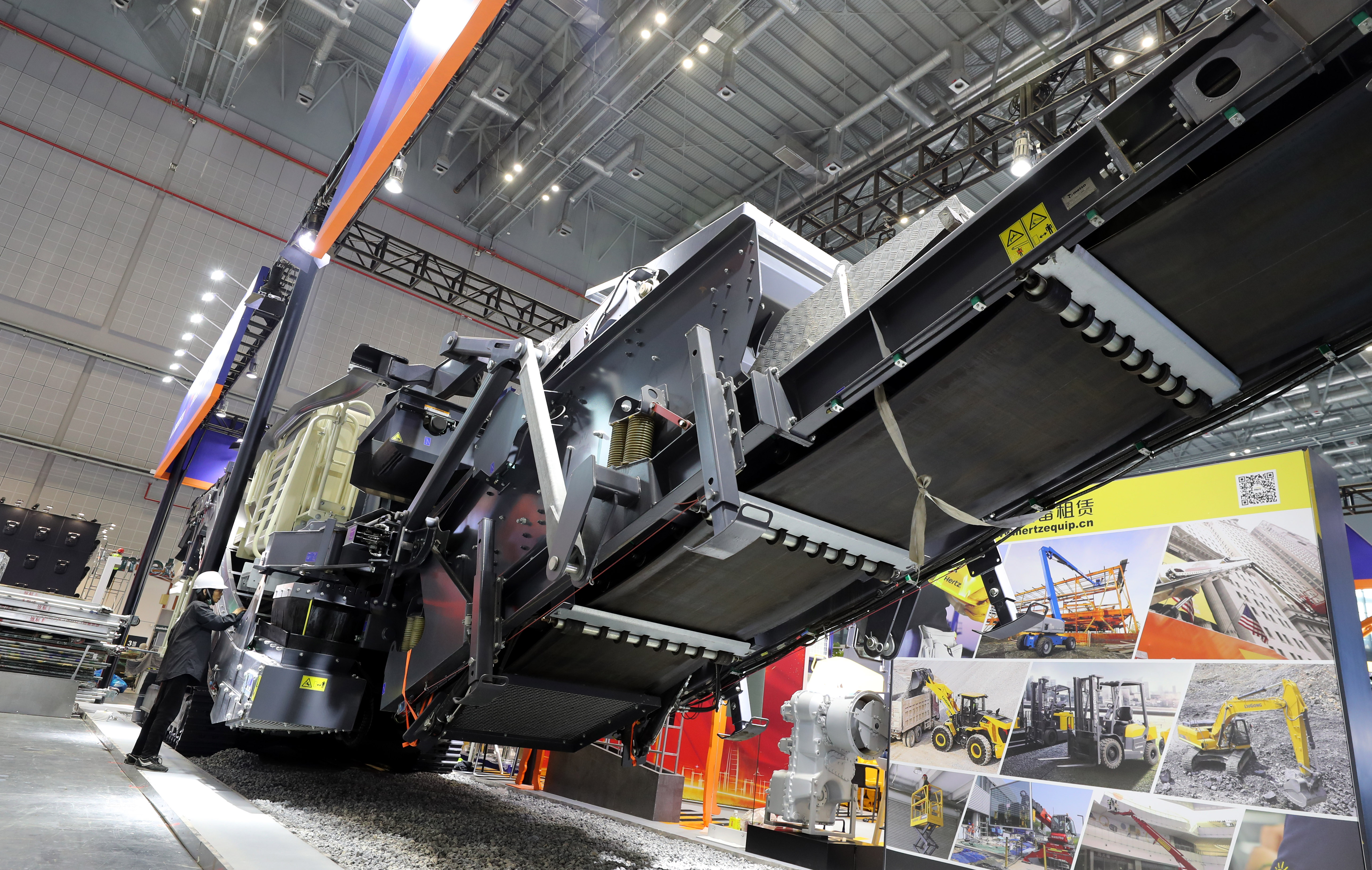 ↑11月2日,工作人员在技术装备展区的展台上对设备进行安装调试。