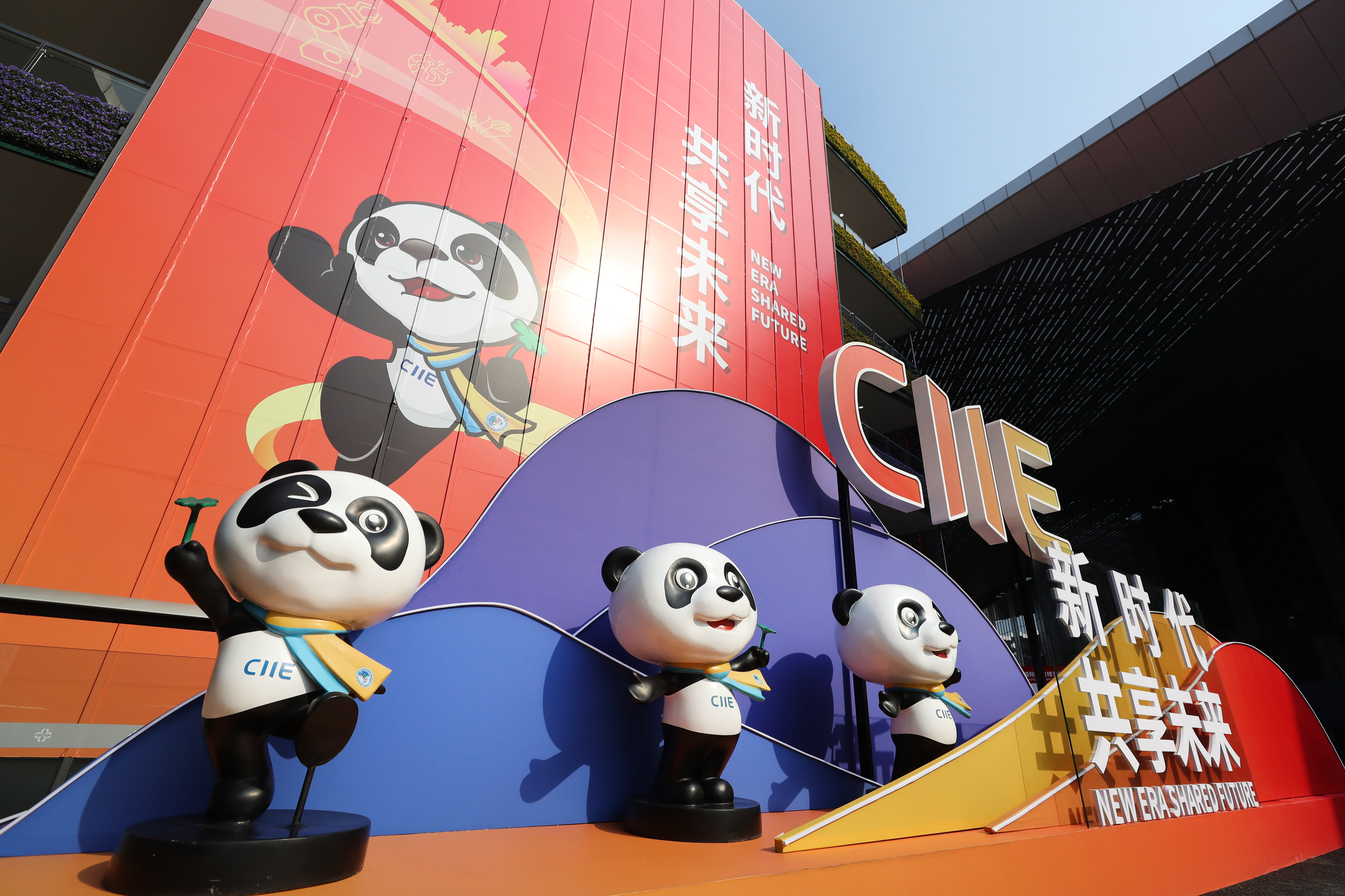 ↑国家会展中心(上海)内布置的熊猫“进宝”主题装饰(11月2日摄)。