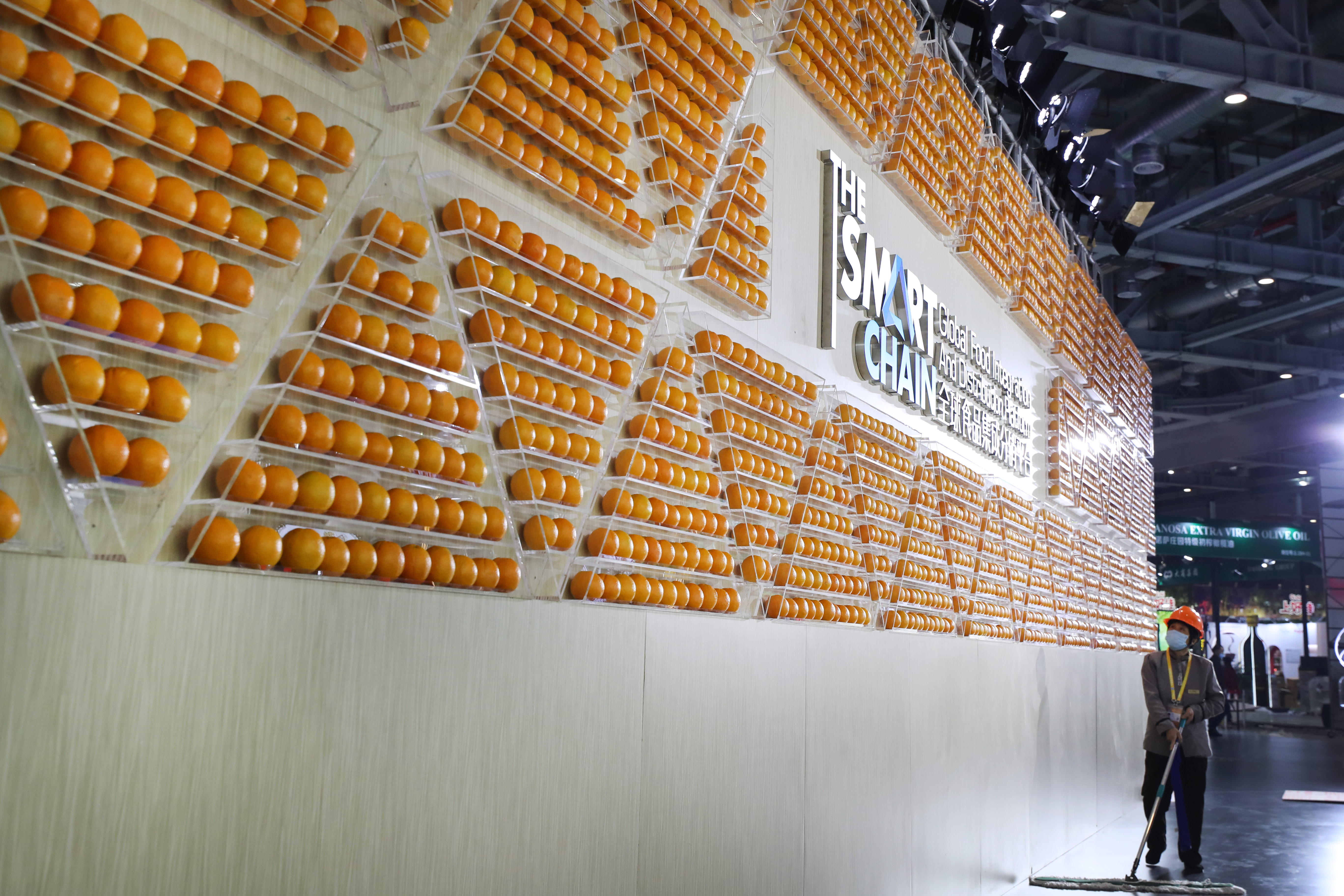 ↑11月2日,一名清洁人员从食品展区一个由新鲜橙子装饰的展板前走过。