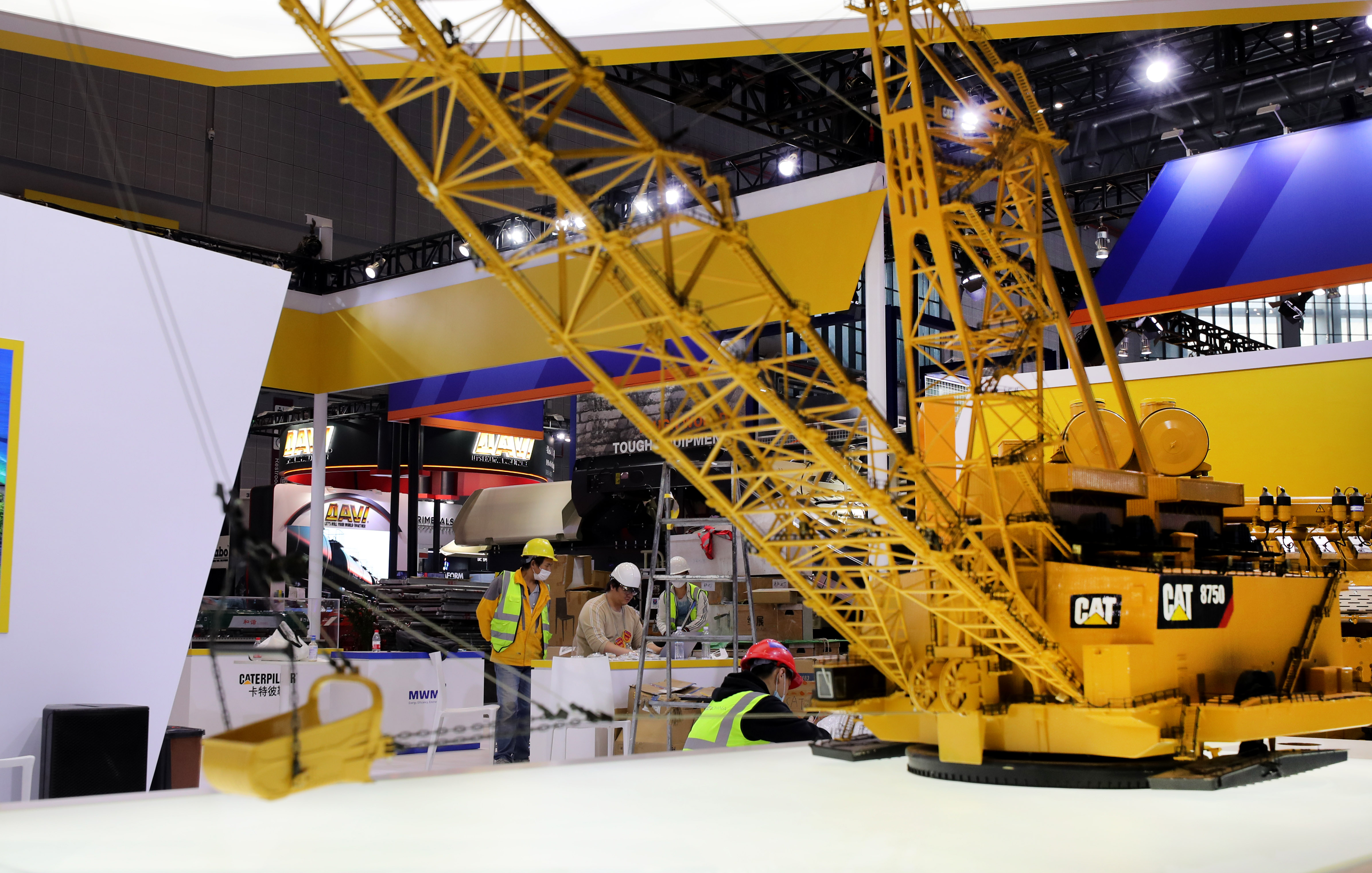 ↑11月2日,工作人员在技术装备展区擦拭展台上一台大型机械展品。