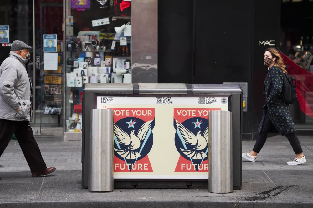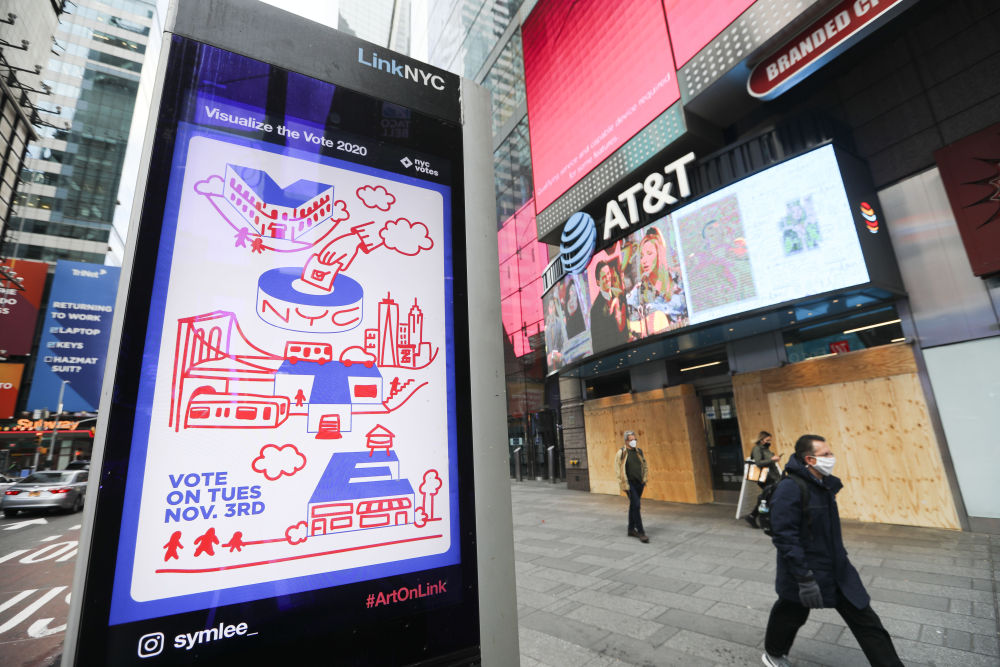 11月3日选举日临近,美国大选进入倒计时,纽约街头布置多处广告,鼓励人们参与投票。