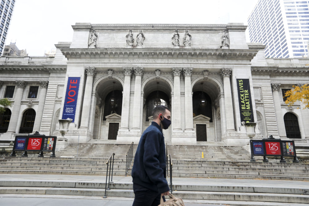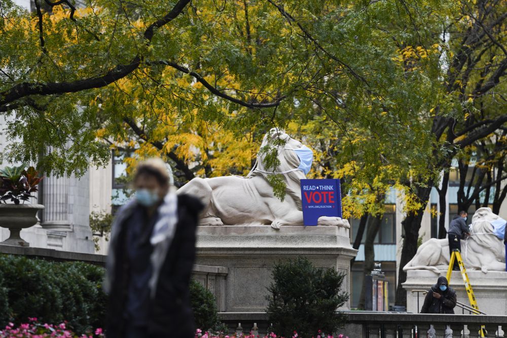 ↑11月2日,行人经过美国纽约公立图书馆外鼓励投票的广告。