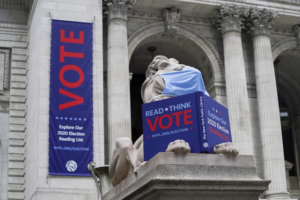 ↑这是11月2日在美国纽约公立图书馆外拍摄的鼓励投票的广告。